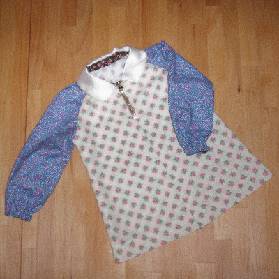 Til jul oppsirkulerte jeg noen stoffrester til en kjole til en fin liten ettåring. A-formet og med silkekrage ble kjolen fin og pyntet, mens resten av kjolestoffet er robust nok til å tåle euforisk krabbeleik!